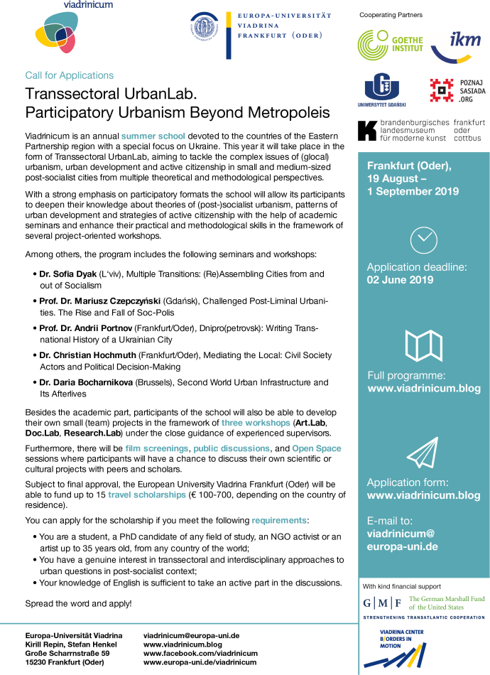 We are delighted to announce our call for applications for the upcoming Summer School Viadrinicum 2019! It will take place under the title “Transsectoral UrbanLab. Participatory Urbanism Beyond Metropoleis” from 19 August to 1 September 2019 at European University Viadrina in Frankfurt (Oder), Germany.