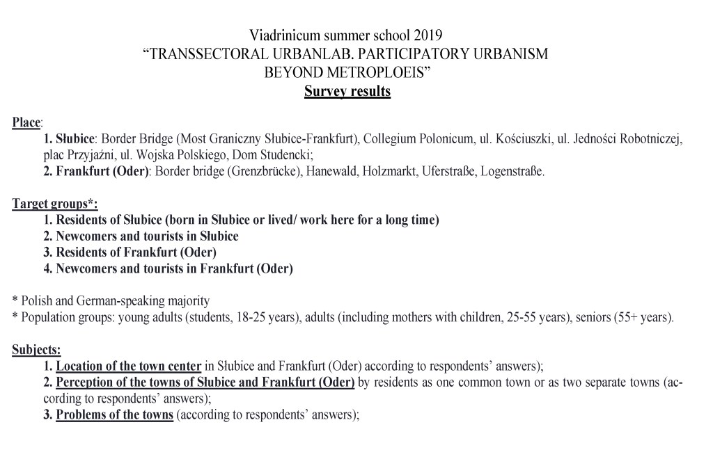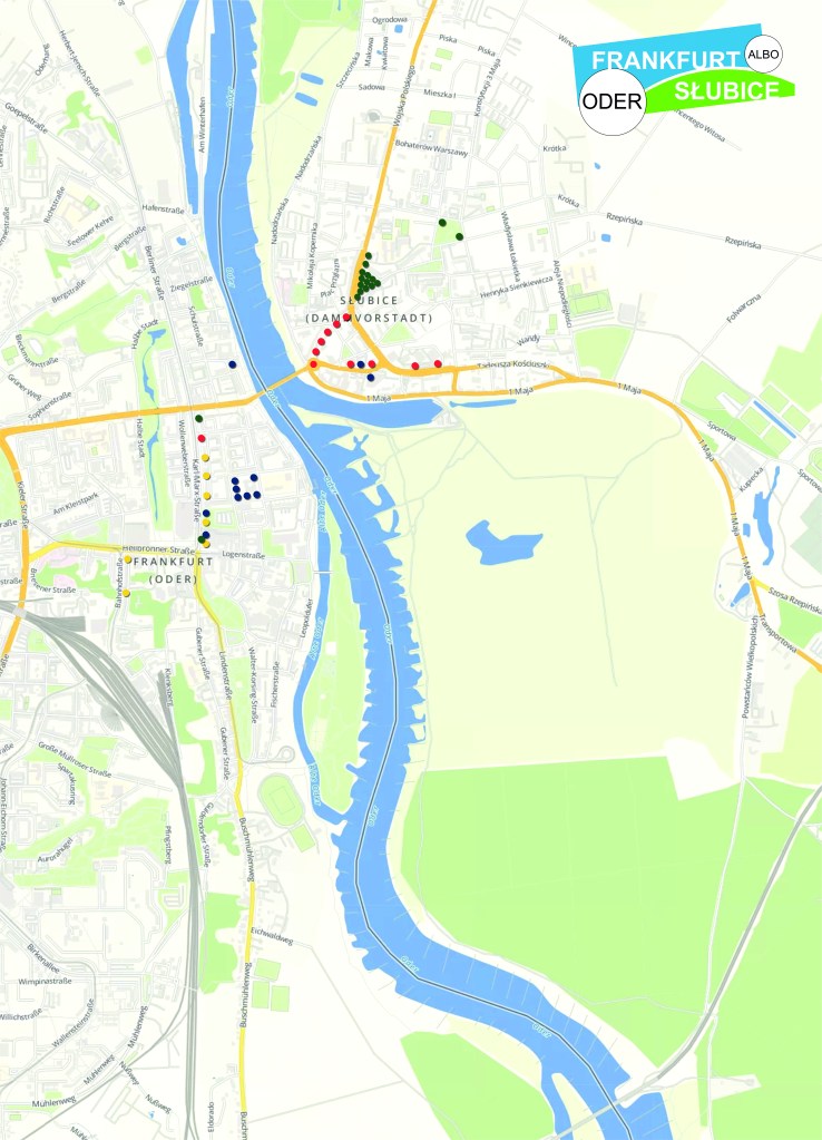 The project was aimed to show the perception of the towns of Słubice and Frankfurt (Oder) by investigating differing groups of people: residents and newcomers/tourists. The goal of the project was to understand the main points of attraction in both towns for the respective target groups and to find out where people “see” a town center and why.