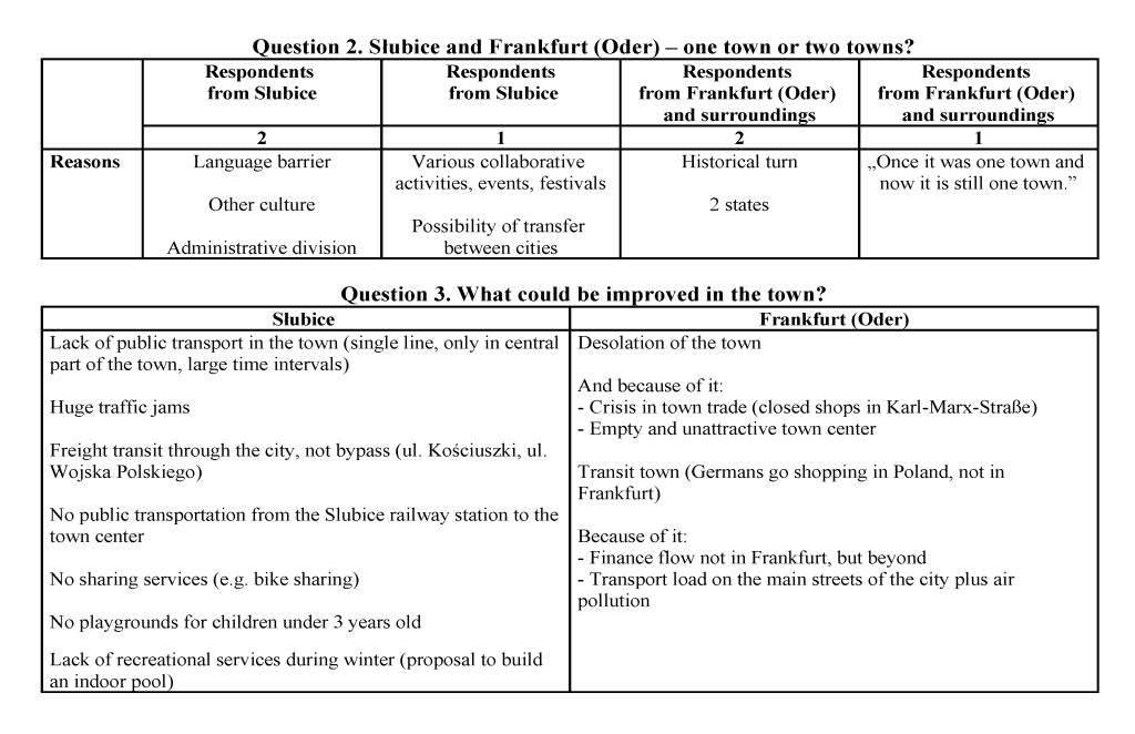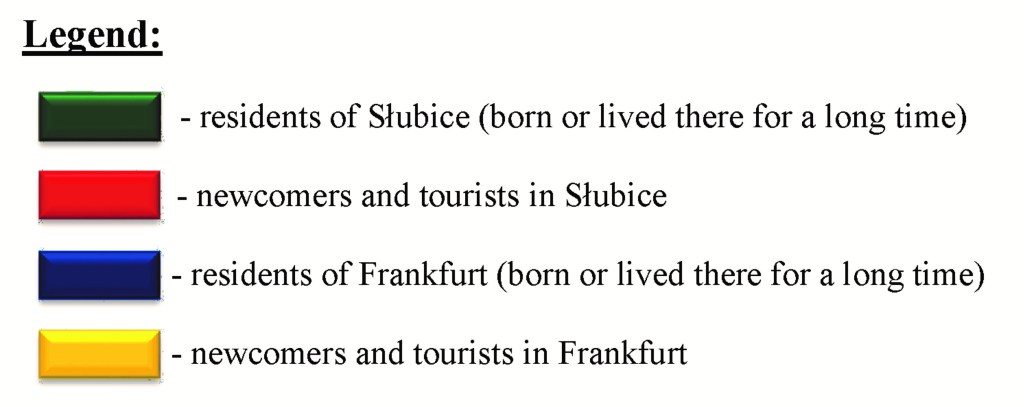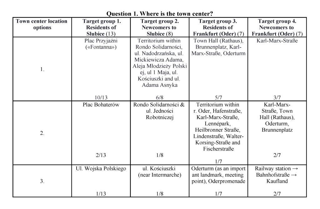 I believe this analysis helped to sort different opinions into a unified form. But also the space for the entry of new questions and deepening research remains open. Turning to the concept of the school – beloning, I noticed while conducting a survey that people who came to Slubice or Frankfurt (Oder) and lived there for more than a year formally become local, as they chose the same place for the city center as the local people. While for the newly arrived the city center was located in the other place.