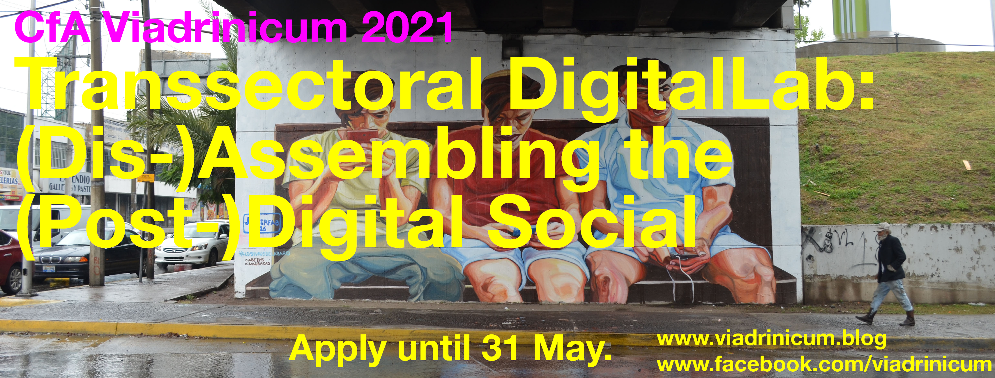 In 2021 summer school Viadrinicum will stick to the hybrid format, tried out in its previous edition. In August 2021 it will take place at the interface of online and offline spaces. Therefore, we warmly invite you to join us for our Transsectoral DigitalLab: (Dis-)Assembling the (Post-)Digital Social. The participation is free of charge. You … Continue reading CfA for Viadrinicum 2021