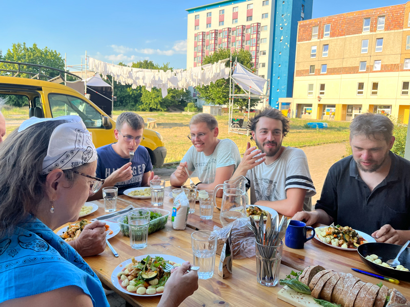 Ein offener Ort, draußen, mitten in der Stadt, wo man sich treffen kann, um gemeinsam Musik zu machen, den Kochlöffel zu schwingen oder über die Zukunft der schönsten Doppelstadt der Welt nachzudenken. Und dabei voneinander, in und mit der Stadt zu lernen. Ein Raum für ein offenes Miteinander zwischen Nachbarn und Nachbarinnen, die sich teilweise gar nicht kennen.