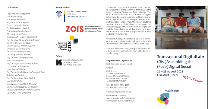 Viadrinicum is an annual summer school devoted to the countries of the Eastern Partnership, and the larger context of Central and Eastern Europe. This year’s edition is designed as a transsectoral DigitalLab, aiming to explore social and political dimensions of digital transformation from multiple theoretical and methodological perspectives.