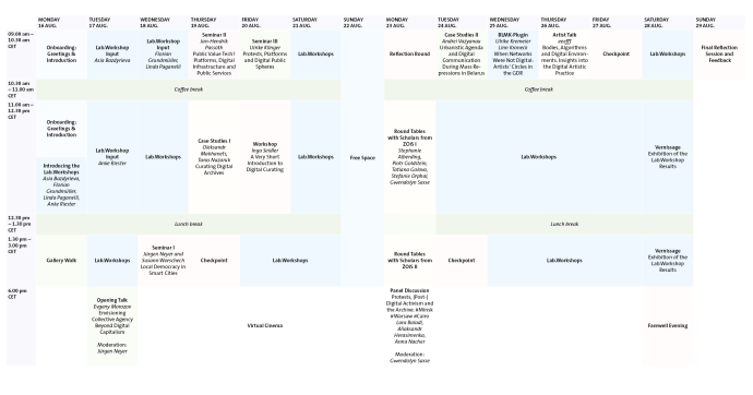 Parallel to that, the school also features three Lab.Workshops (Art.Lab, Doc.Lab, Research.Lab), where the participants will be able to enhance practical and methodological skills, by means of developing their own small (team) projects under the close guidance of facilitators from the respective fields.